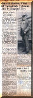 Picture Number 29. GENERAL HARLESS, CHIEF OF CONFEDERATE VETERANS, DIES IN HOSPITAL HERE Survivors of Souths Army in County Reduced to Four Brig.-Gen. N.B. Harless, honorary commander-in-chief of the United Confederate Veterans, died at 10:45 a.m. today in Methodist Hospital. He was 93. With his death the number of Confederate veterans living in Houston dwindled to four. General Harless had been in good health until a few days ago when he suffered a heart attack. Only last week he and his comrades were guests of honor at a dinner given by the Womens City Club. General Harless, who became one of Houstons most beloved figures, was born in New Hope, Ala., April 27, 1845, the son of Thomas and Ellen Ellison Harless. At the outbreak of the Civil War he was to young for enlistment but took up arms and fought in the ranks in spite of his youth. On Jan. 1, 1862, after almost two years of active service, he was officially enlisted in Company H. Forty-ninth Regiment at Huntsville, Ala. He served throughout the remainder of the war and fought in many of the more important battles. At the close of the war he returned to Alabama and in 1870 came to Texas by boat to make his home. He settled first at Chapel Hill, where he was employed by John K. Carlisle, a Planter and former Confederate soldier. He later moved to Nevada, Texas, and in 1906 came to Houston to make his home with his son, Ben F. Harless. For some time prior to his retirement he was associated with Bering & Cortes, Hardware Company and later with his son in the jewelry business. Important recognition for his service during the war came to General Harless some years ago when he was chosen commander of the Dick Dowling Camp, U. C. V. He later was chosen commander of the Texas Division of the U.C.V. and then elevated to the position of commander of the Trans-Mississippi Division. He held this command until last autumn, when he was chosen honorary Confederate commander for life at the Confederate Veterans reunion in Columbia, S.C. This command has been held by only two other persons. General Harless attended practically every Confederate reunion that was held. He participated actively in the last reunion at Columbia that was attended by less than 250 former Southern soldiers whose ages ranged from 90 to 105. Only a few months prior to that time he had achieved one of his greatest ambitions by attending the reunion of Confederate and Northern soldiers at Gettysburg. He had anticipated attending another reunion next year and only a short while ago expressed the belief that there will be a Confederate reunion as long as there are two Confederate soldiers left. HIS BEST LISTENER Remarkably alert for his age, General Harless liked nothing better than to spin yarns of his war days. One of his best listeners was Gen. John Shearer, former member of the Grand Army of the Republic. General Harless was deeply interested in all patriotic and civic celebrations and always attended such affairs in his beloved gray uniform. Springfield, Ill, Journal 1/4/1939 WEEPS AT BIER OF CIVIL WAR ENEMY Houston, Tex, Jan 3. An old soldier of the north, John Shearer, 91, who marched to the sea with General Sherman, marched tonight to the bier of N. B. Harless, 92, an old soldier of the south, and wept. Pledged to kill each other in their teens, they came to the sunset of life as warm friends. Harless, a private in the Confederate army, but eventually a general commanding the trans-Mississippi department of the gray-clad veterans, died today of a heart ailment. Shearer, the last man of the army of the north still living in Houston, said, We fought each other at Vicksburg, but that was a long, long time ago. Today we were like brothers. He was a fine and brave old man. Submitted by Misty |