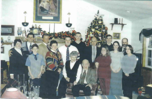 Pollianna(Polli)(Cook)Bates-oldest, John W. Bates, Charles Paul Bates, Gary L.Johnson, Leah Rose(Cook)Johnson 3rd, Jared Andrew Johnson, older son, Aaron Blake Johnson-second son, William Curtis(Bill)Cook-2nd, Pamela Sue(Pam)(Morrill)Cook-Bill's wife, Aaron Miller, Paula Rose(Cook)Miller-1st of Bill & Pam, Edward Charles(Ed)-4th of Bill & Mary Ellen, Andrea Beth Cook-2nd of Bill & Pam. Andrea is new mother of TimothyZionCook,born 2-25-01. Seated Bill & Mary Ellen Cook Submitted by John & Polli Bates (JohnPolliB@webtv.net)