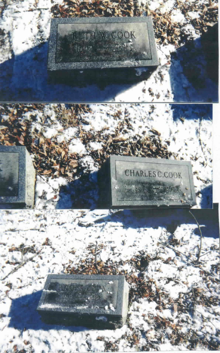 HEADSTONES READ: Ruth W. Cook 1892 - 1945 Charles C. Cook 1887 - 1972 Adah R. Cook 1917 - 1919 Submitted by John & Polli Bates (JohnPolliB@webtv.net)