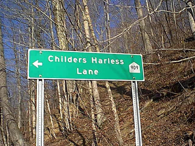 Childers-Harless Lane sign on the way up to the Cemetery listed in the next few photos! Submitted by Jack Childers (CHILFAM@aol.com)